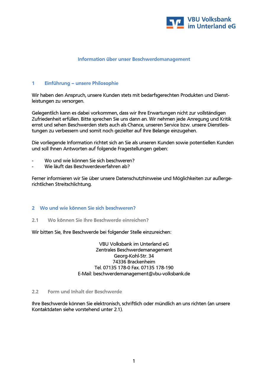 Bei Streitigkeiten mit der VBU Volksbank im Unterland eG besteht die Möglichkeit, sich an die Kundenbeschwerdestelle vom Bundesverband der Deutschen Volksbanken- und Raiffeisenbanken zu wenden. Das Anliegen ist in Textform an die folgende Adresse zu richten: